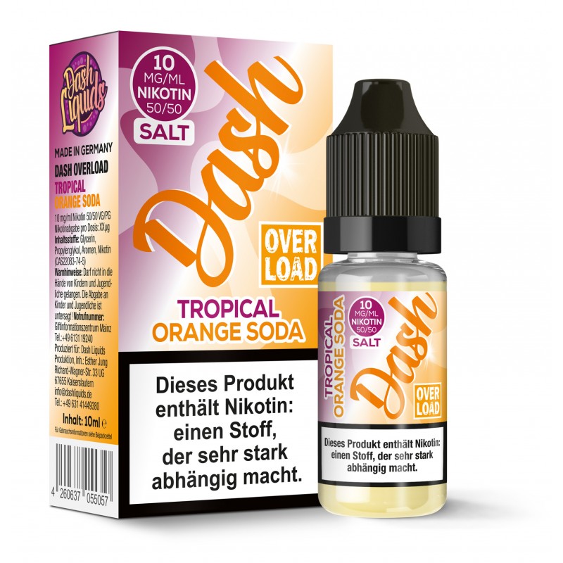- 1x Dash Overload Tropical Orange Soda Nikotinsalz Liquid 10 ml (je nach Variante)