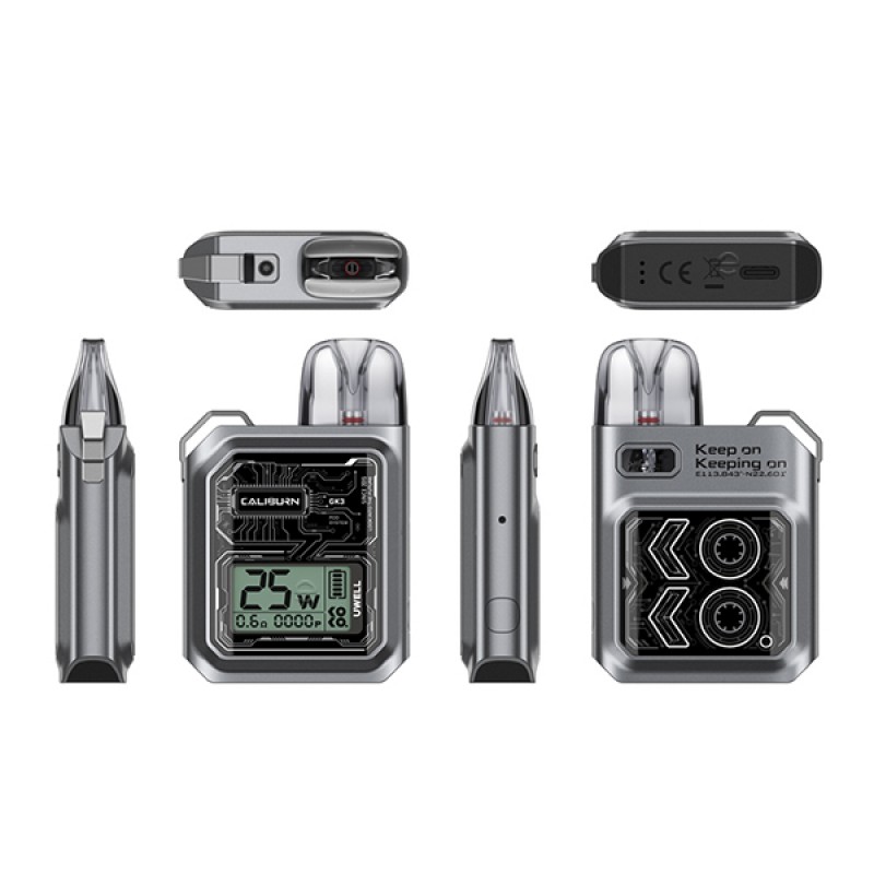 Produktinformationen "Uwell Caliburn GK3 Kit 900 mAh 2,5ml" Länge: 74.8 mmBreite: 49.2 mmTiefe: 17.1 mmGewicht: 52.0 gFüllvolumen: 2.5 mlPod-System für MTL und RDLModernes Design mit transparente..